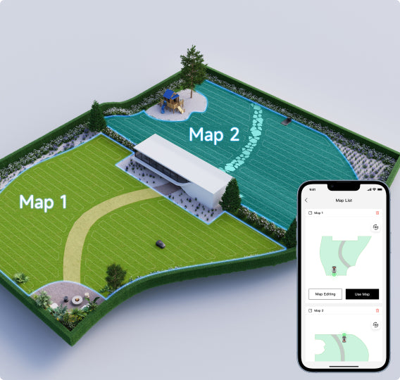 MOVA 1000/600 er utviklet for boliger med for- og bakhager som ikke henger sammen, og lar deg opprette og administrere to uavhengige kart. Tilpass separate klippetidsplaner for hvert område, slik at effektiviteten maksimeres. Det er også ideelt for de som eier flere eiendommer.
