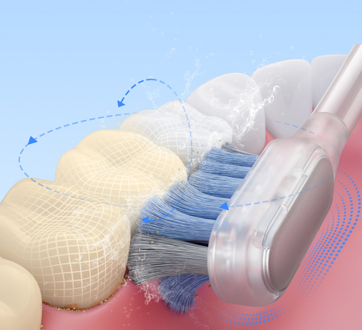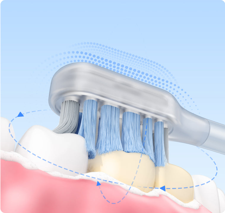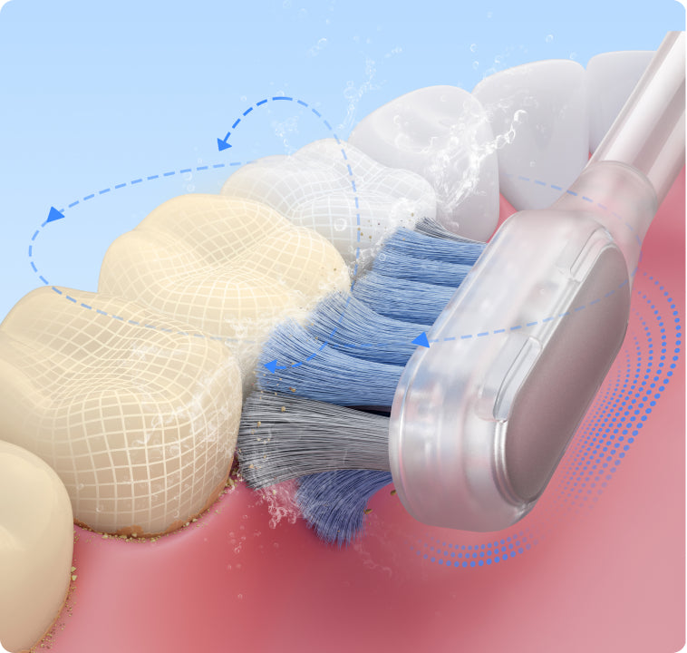 Utvidet børste når helt til de bakre tennene i 0,01 mm* i mellomrommet mellom tennene og tannkjøttet, mens den konturerte børsten som omringer tennene rengjør gingival sulcus effektivt.