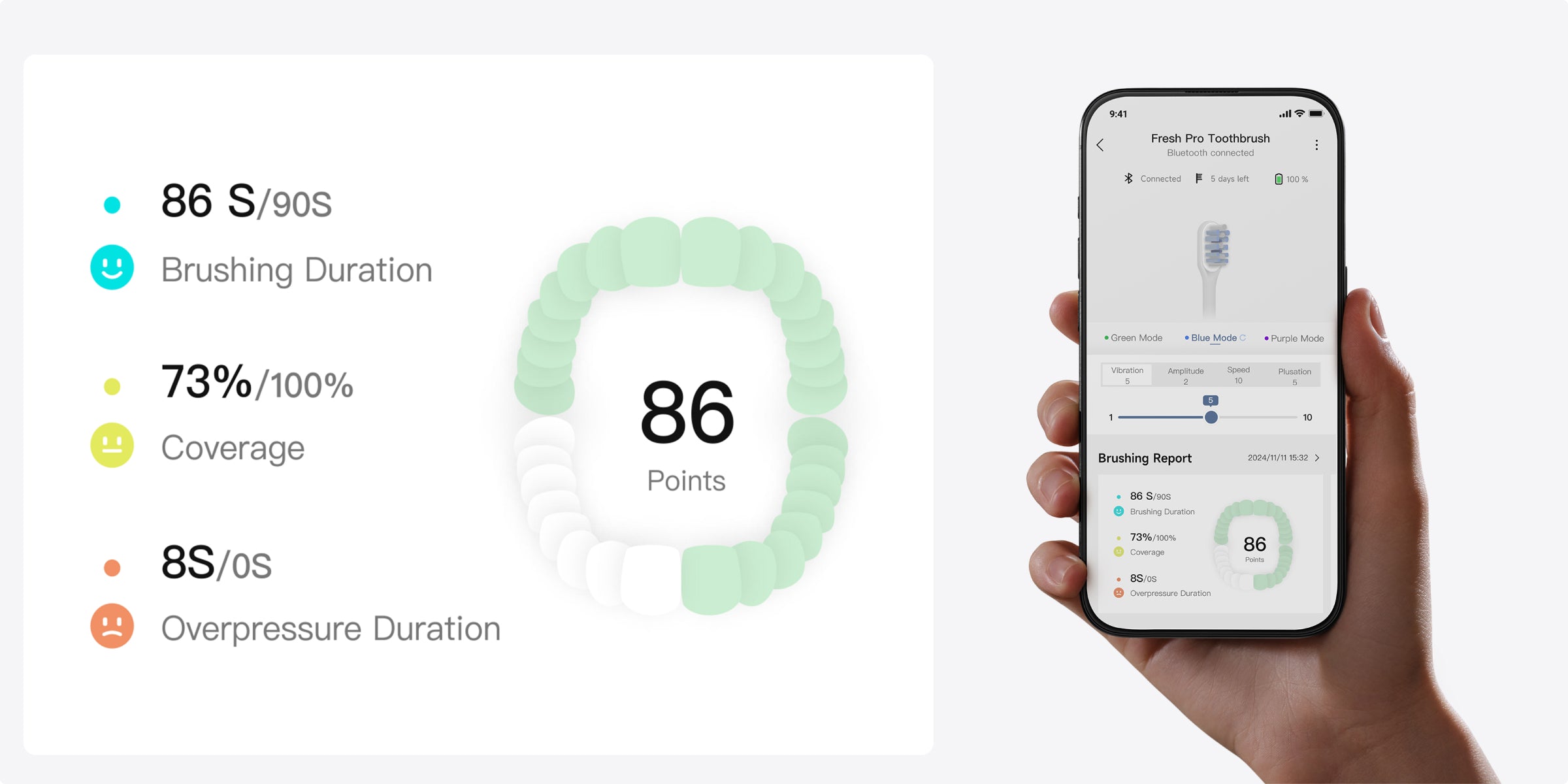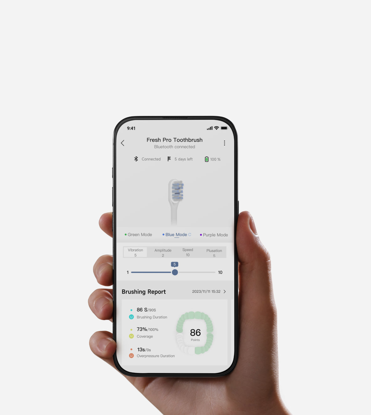 *30 dager: Basert på to minutter med børsting daglig (Fresh Pro: ett minutt hver morgen og kveld; Fresh: to minutter på morgenen og kvelden) i standardmodus. Basert på våre interne laboratoriedata. Faktisk ytelse kan variere avhengig av bruk.