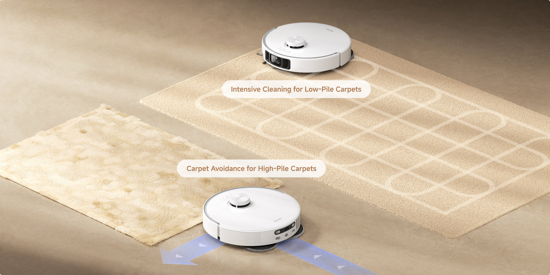 *10,5 mm: Høydeforskjellen på robotstøvsugeren er 10,5 mm før og etter heving av mopp. For tepper med hår som er lengre enn 3 mm, anbefaler vi at du stiller inn robotstøvsugeren slik at den unngår tepper med middels eller lange hår. Dermed beskyttes teppene mot å bli våte.