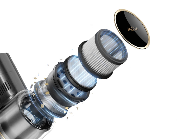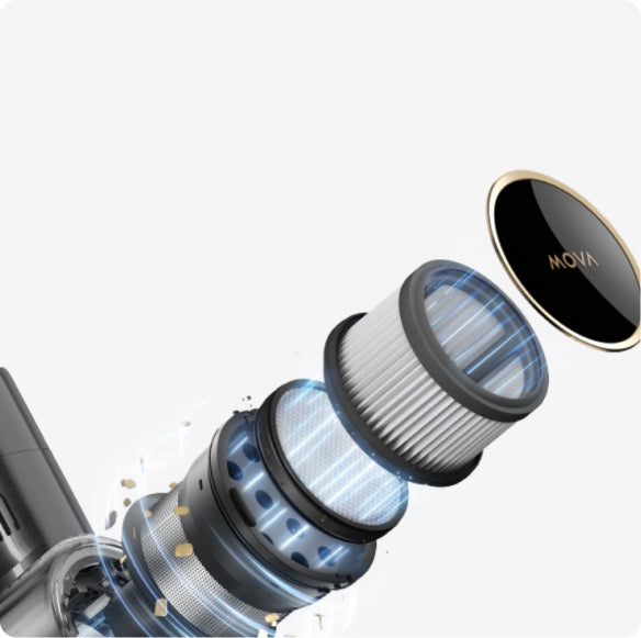 Et flerlags filtreringssystem fanger effektivt opp fint støv og partikler ned til 0,3 μm*, noe som forhindrer at det slippes ut i luften, med en filtreringseffektivitet på opptil 99,9 %*.