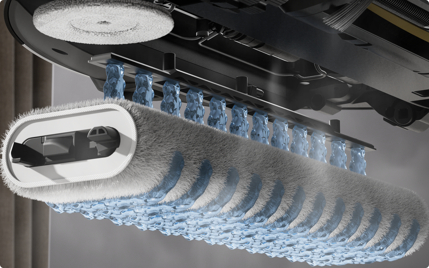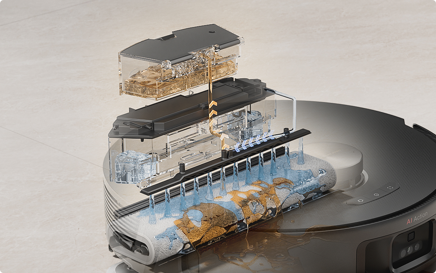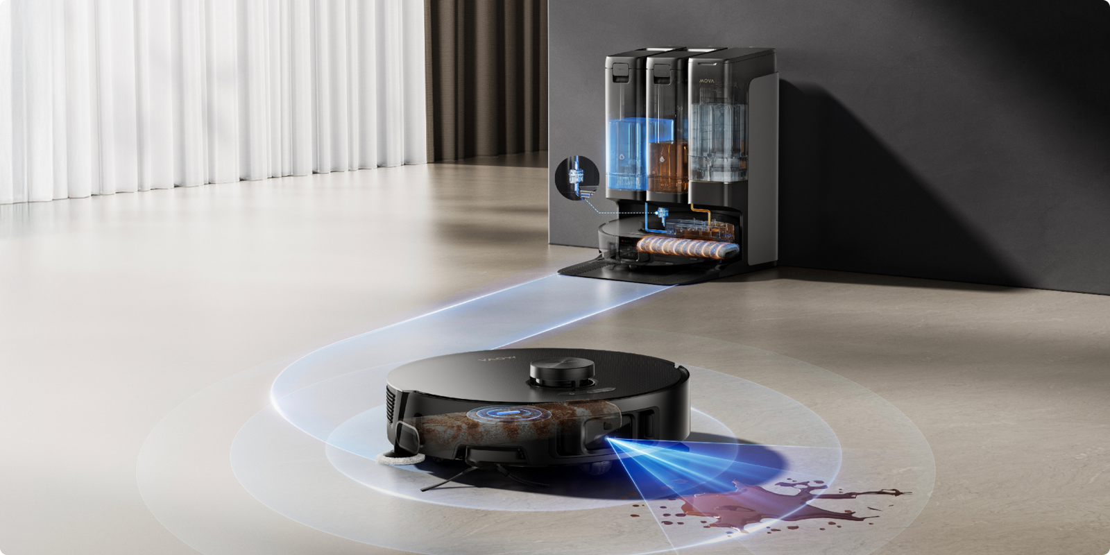 * "MOVA-innovasjon" Oppdagelse av flere smusstyper i sanntid: «MOVA-innovasjon» refererer her til kombinert bruk av KI i front, doble RGB-kameraer, innebygd fargesensor på moppen og multispektral turbiditetsdeteksjon i basestasjonen for smart gjenkjenning.